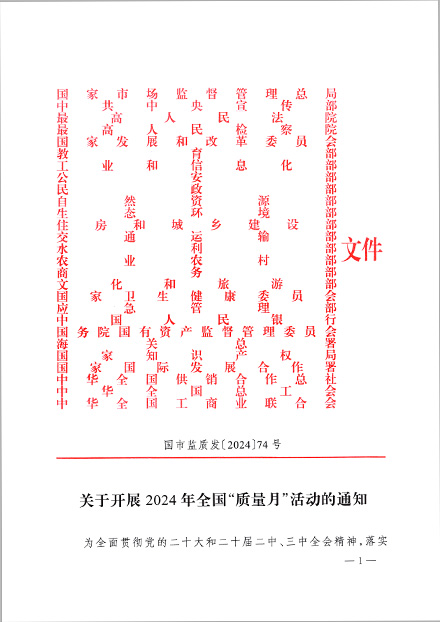 2024年9月,市場監(jiān)管總局、中央宣傳部、最高人民法院、最高人民檢察院、國家發(fā)展改革委等27個部門以“加強(qiáng)質(zhì)量支撐 共建質(zhì)量強(qiáng)國”為主題,聯(lián)合開展2024年全國“質(zhì)量月”活動,全面貫徹黨的二十大和二十屆二中、三中全會精神,落實《質(zhì)量強(qiáng)國建設(shè)綱要》(以下簡稱《綱要》)部署,深入推動全民質(zhì)量行動。